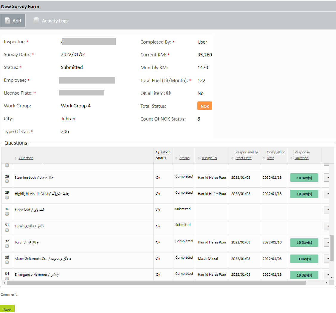 - تخصیص هر مورد از چک لیستها با توجه به نتیجه آزمون دورهای به یک کاربر مسئول یا مالک وسیله نقلیه(و یا منبع) جهت بررسی و تعمیر